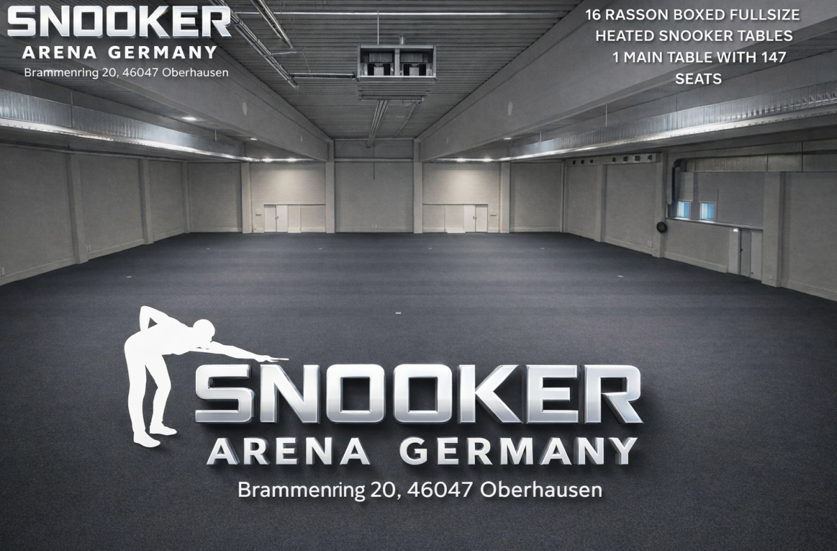 Mit der Snooker Snooker Arena Germany Oberhausen entsteht ein europaweit einzigartiges Zentrum für Breiten- und Leistungssport. Auf rund 2.000 Quadratmetern bietet die topmoderne Anlage ideale Bedingungen für Training, Wettkampf und mediale Inszenierung – ausgestattet mit 17 edlen 12-Fuß-Tischen der Marke Rasson Magnum II, einer mobilen Tribüne für 150 Zuschauer sowie modernster Analyse- und Studiotechnik.