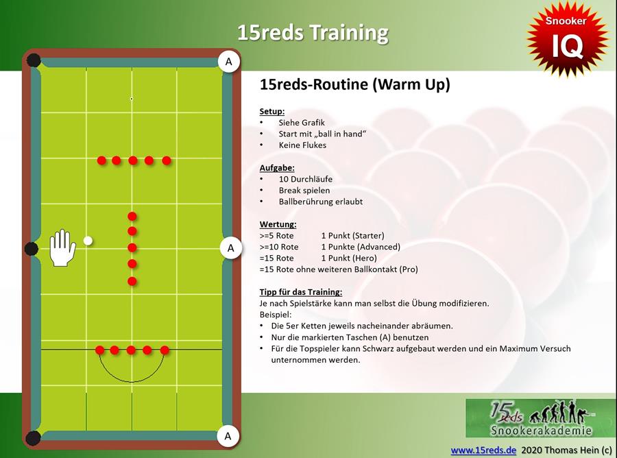 Entweder bis bald in der 15reds Snookerakademie oder viel Spaß mit der Übung am Tisch.