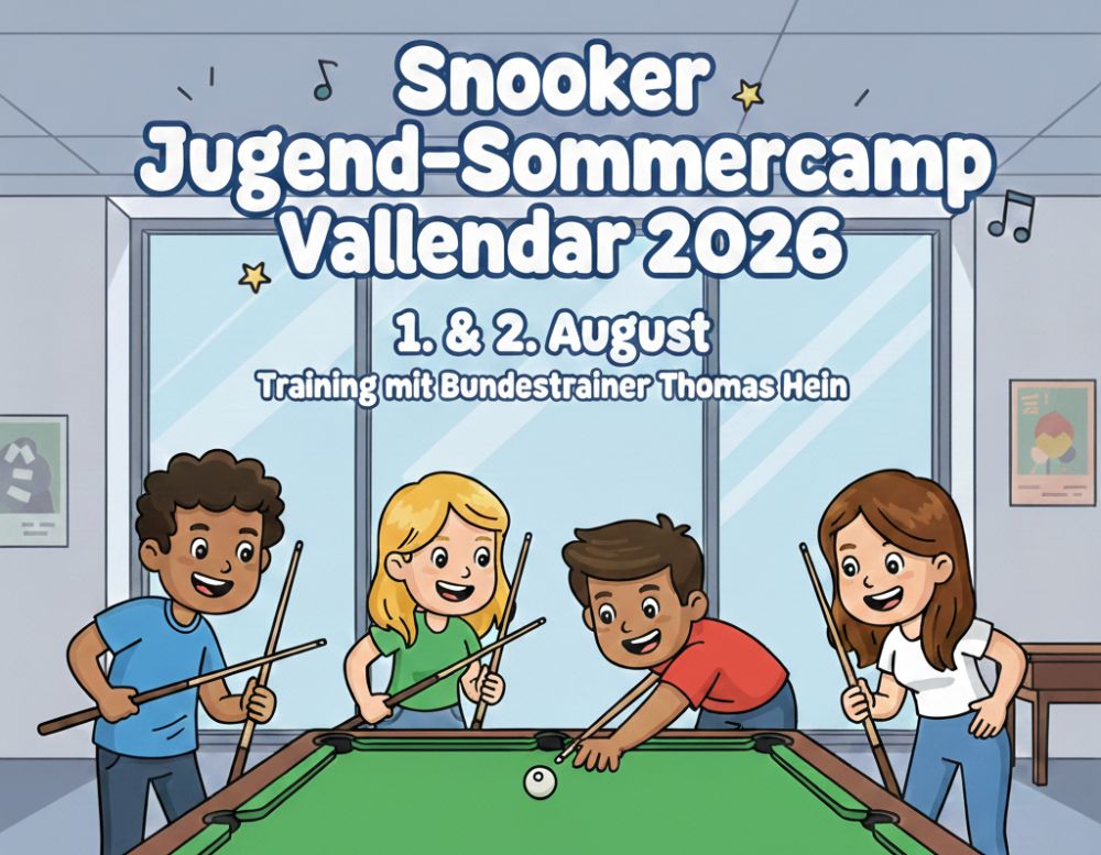 Das Snooker Jugend‑Sommercamp findet am 1. und 2. August 2026 in Vallendar statt. Teilnehmen können Kinder und Jugendliche unter 18 Jahren. Die Gruppe ist auf maximal 8 Personen begrenzt.